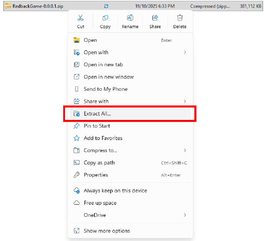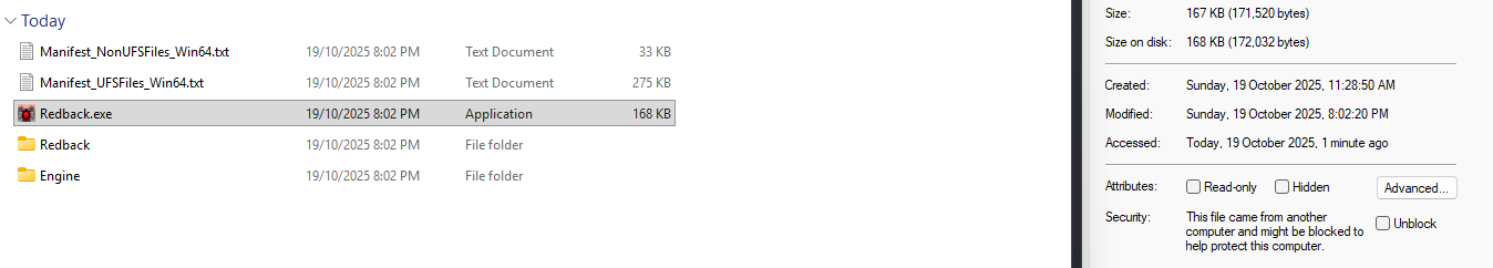 3. Open the unzipped folder and right click on Redback.exe. Click on Properties (the popup on the right should show up)