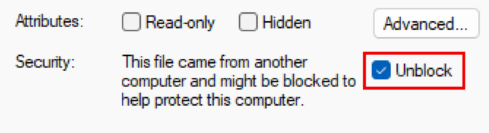 4. Tick the checkbox Unblock. After doing this the box will disappear, you only need to do this once.